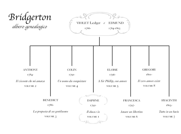 Questo è il primo di una serie di otto romanzi dedicati alla famiglia Bridgerton. Otto come il numero di fratelli e sorelle Bridgerton, ciascuno dei quali è protagonista di un romanzo, come si può vedere dallo schema sottostante, riportato all’inizio di ciascuno dei romanzi.